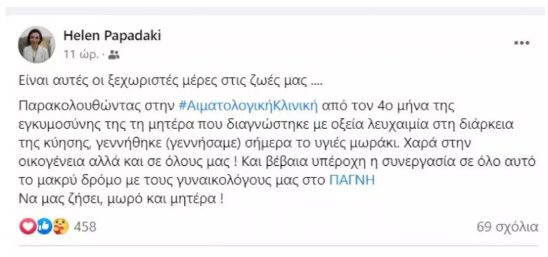 Η γιατρός ανέφερε επίσης στην ανάρτησή της: «Παρακολουθώντας στην Αιμοτολογική κλινική από τον 4 μήνα της εγκυμοσύνης της τη μητέρα, που διαγνώστηκε με οξεία λευχαιμία στη διάρκεια της κύησης, γεννήθηκε (γεννήσαμε) σήμερα το υγιές μωράκι. Χαρά στην οικογένεια και σε όλους μας. Να μας ζήσει, μωρό και μητέρα».