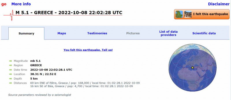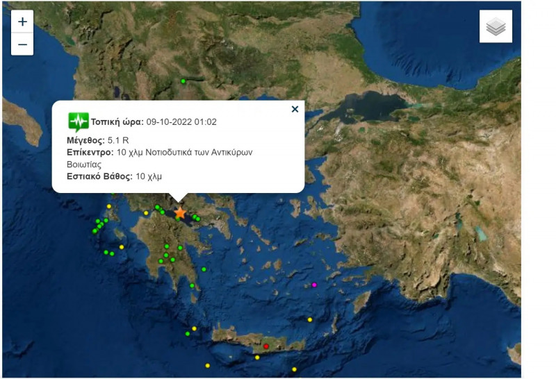 Σεισμική δόνηση μέγεθος 5,1 βαθμών της κλίμακας ρίχτερ σημειώθηκε στη 1:02 π.μ., της Κυριακής 9 Οκτωβρίου 2022, με επίκεντρο σε θαλάσσια περιοχή, 16 χλμ Ν.Α. του Γαλαξιδίου, σύμφωνα με το Εθνικό Αστεροσκοπείο. Ο σεισμός είχε εστιακό βάθος 10 χλμ.