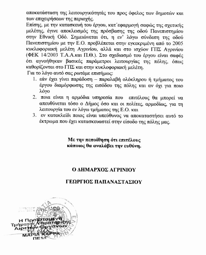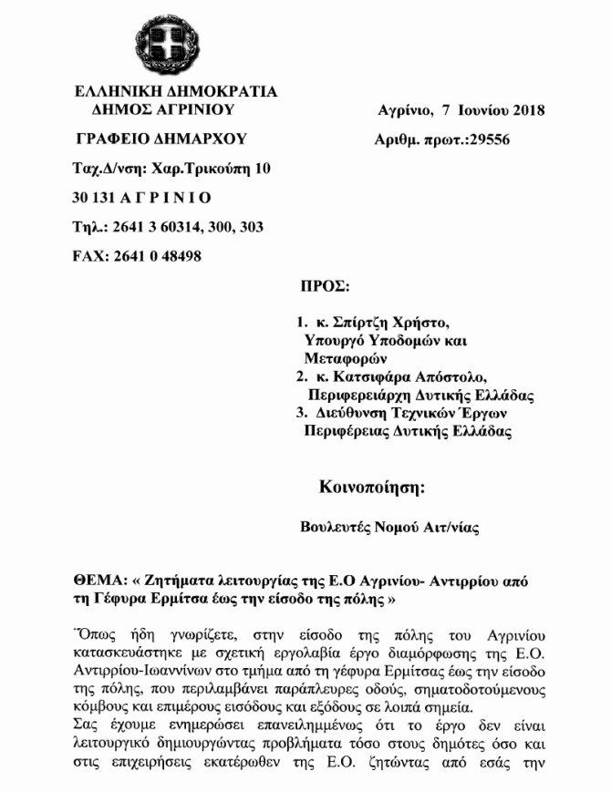 Κατέθεσαν ΑΝΑΦΟΡΑ την επιστολή του Δήμου Αγρινίου για ζητήματα που αφορούν τη λειτουργία της ΕΟ Αγρινίου – Αντίρριου από τη Γέφυρα Ερμίτσα ως την είσοδο της πόλης.
