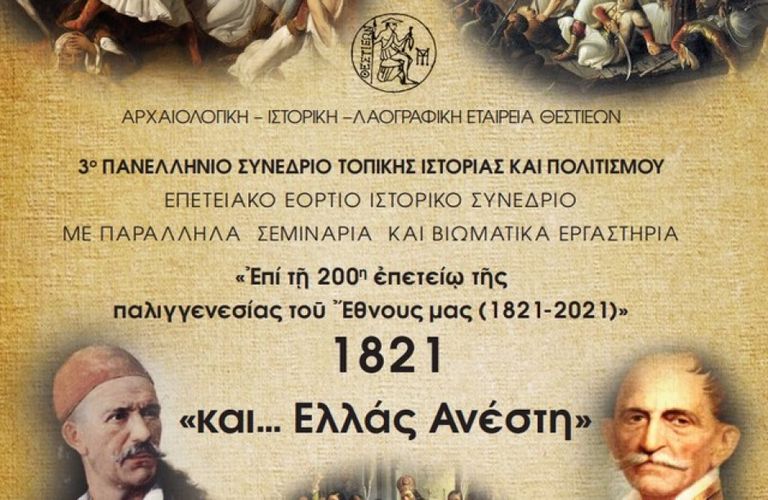 Η Αρχαιολογική – Ιστoρική – Λαoγραφική Εταιρεία Θεστιέων διοργανώνει το 3ο Συνέδριο με θέμα: «Η Τριχωνία (Βραχώρι, Απόκουρο, Αρακαμπύλια και Ζυγός) και άπασα η Αιτωλία στο χώρο της Δυτικής Ρούμελης κατά τα προεπαναστατικά, επαναστατικά και μετεπαναστατικά χρόνια του 1821 – Ο δικός μας τόπος» στο Καινούργιο του Δήμου Αγρινίου στις 3, 4 και 5 Σεπτεμβρίου 2021.