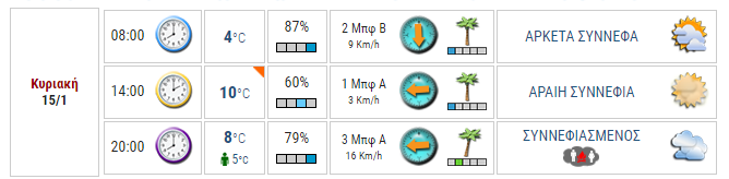 Την Κυριακή 15 Ιανουαρίου 2017 αρχικά θα επικρατήσουν καλές καιρικές συνθήκες στις περισσότερες περιοχές της χώρας, με εξαίρεση το Ανατολικό Αιγαίο όπου θα εκδηλώνονται βροχές και σποραδικές καταιγίδες με σταδιακή βελτίωση. Ωστόσο από τις απογευματινές ώρες στα δυτικά και νότια ο καιρός θα παρουσιάσει σημαντική επιδείνωση με κύρια χαρακτηριστικά τις βροχές στα πεδινά, τις καταιγίδες κυρίως πάνω από τη θάλασσα και τις χιονοπτώσεις στα ορεινά. Τα φαινόμενα θα είναι κατά τόπους ισχυρά και μέχρι αργά το βράδυ θα επεκταθούν στη Στερεά, στη Θεσσαλία, στις Σποράδες και στην Κεντρική και Δυτική Μακεδονία. Χιονοπτώσεις αναμένονται αργά το βράδυ σε ημιορεινά τμήματα της Θεσσαλίας και της Ηπείρου, καθώς και σε περιοχές της Βόρειας Θεσσαλίας και της Μακεδονίας με χαμηλότερο υψόμετρο. Παγετός θα εκδηλωθεί τις πρωινές και βραδινές ώρες στα κεντρικά και βόρεια ηπειρωτικά.