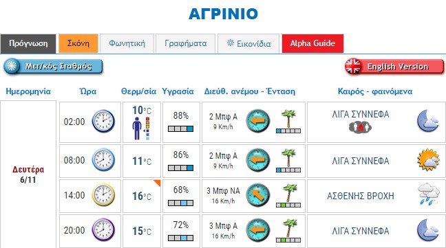 Ο καιρός στο Αγρίνιο σήμερα (Δευτέρα, 06/11)
