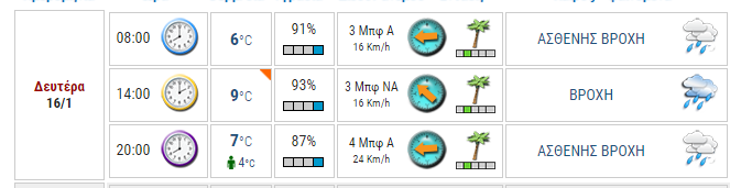 Τη Δευτέρα 16 Ιανουαρίου 2017 στη Δυτική Ελλάδα, στο Ανατολικό και Νότιο Αιγαίο, στην Εύβοια, στις Σποράδες, στην Ανατολική Στερεά και στην Ανατολική Θεσσαλία θα εκδηλώνονται κατά τόπους ισχυρές βροχοπτώσεις. Σποραδικές καταιγίδες θα εκδηλωθούν κυρίως στα δυτικά ηπειρωτικά, στο Ιόνιο και στο Αιγαίο. Πυκνές χιονοπτώσεις αναμένονται σε όλα τα ηπειρωτικά ορεινά, σε ημιορεινά τμήματα της Θεσσαλίας και της Ηπείρου, καθώς και σε περιοχές της Μακεδονίας με ακόμη χαμηλότερο υψόμετρο. Στη Νοτιοανατολική Στερεά, στην Πελοπόννησο και στις Κυκλάδες τις μεσημεριανές και απογευματινές ώρες ο καιρός θα είναι βελτιωμένος, με νέα επιδείνωση το βράδυ. Αντίθετα πρόσκαιρη βελτίωση του καιρού αναμένεται το βράδυ στην Ανατολική Μακεδονία και στη Θράκη. Παγετός θα εκδηλωθεί τις πρωινές και βραδινές ώρες στα κεντρικά και βόρεια ηπειρωτικά.