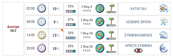 Νεφώσεις με βροχές και σποραδικές καταιγίδες στη Δυτική Ελλάδα, στη Θράκη και κυρίως στο Ανατολικό Αιγαίο όπου τα φαινόμενα θα είναι κατά τόπους ισχυρά, περιμένουμε τη Δευτέρα 20 Φεβρουαρίου 2017. Σταδιακά τα φαινόμενα θα περιοριστούν στα νησιά του Ανατολικού Αιγαίου. Ωστόσο κατά τις θερμές ώρες της ημέρας πρόσκαιρες βροχές ή καταιγίδες ενδέχεται να εκδηλωθούν στην Ανατολική Στερεά, στην Εύβοια και στη Βορειοανατολική Πελοπόννησο. Τις πρωινές ώρες η ορατότητα θα είναι κατά τόπους περιορισμένη και θα σχηματιστούν ομίχλες.