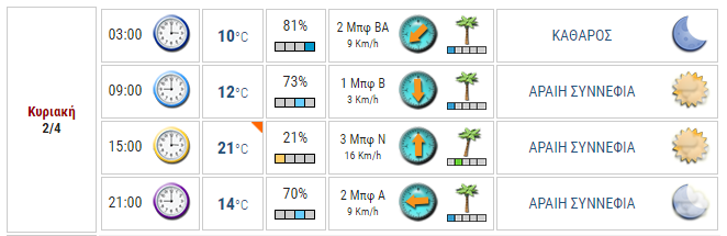Την Κυριακή, 2 Απριλίου 2017 αναμένεται αρχικά αίθριος καιρός σε όλη τη χώρα. Από το πρωί όμως θα αναπτυχθούν νεφώσεις στα δυτικά ηπειρωτικά και το Ιόνιο, οι οποίες σταδιακά θα επεκταθούν και στην υπόλοιπη ηπειρωτική χώρα, με εξαίρεση τη Μακεδονία και τη Θράκη. Λίγες τοπικές βροχές θα σημειωθούν μετά το μεσημέρι στα δυτικά ηπειρωτικά και το Ιόνιο. Η ορατότητα κατά τη διάρκεια της νύχτας στα ηπειρωτικά θα είναι τοπικά περιορισμένη. Οι άνεμοι στα πελάγη θα φτάνουν τοπικά τα 7 μποφόρ.