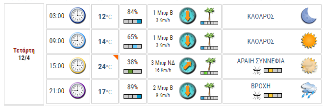 Για τη Μεγάλη Τετάρτη 12 Απριλίου 2017 στα κεντρικά, νότια τμήματα της χώρας και τα νησιά του Ανατολικού Αιγαίου προβλέπονται νεφώσεις παροδικά αυξημένες, με τοπικές βροχές τις πρωινές ώρες στην Κρήτη και το Νοτιοανατολικό Αιγαίο, ενώ στην υπόλοιπη χώρα ηλιοφάνεια με λίγες νεφώσεις όπου γρήγορα στα δυτικά και βόρεια ηπειρωτικά θα αυξηθούν και τις μεσημεριανές και απογευματινές ώρες αναμένονται τοπικοί όμβροι ή μεμονωμένες καταιγίδες κυρίως στην Ήπειρο και τη Μακεδονία. Κατά τόπους περιορισμένη ορατότητα στα κεντρικά και βόρεια ηπειρωτικά τις νυκτερινές και πρώτες πρωινές ώρες.