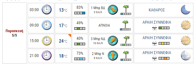Την Παρασκευή, 5 Μαΐου 2017, στην κεντρική και βόρεια χώρα αναμένονται αραιές νεφώσεις που κατά τόπους θα είναι πυκνότερες. Στα υπόλοιπα ηπειρωτικά ο καιρός θα είναι αρχικά αίθριος, όμως από το μεσημέρι θα αναπτυχθούν τοπικές νεφώσεις. Στο κεντρικό και νότιο Αιγαίο καθώς και στο Ιόνιο αναμένεται γενικά αίθριος καιρός. Τοπικές βροχές και σποραδικές καταιγίδες αναμένονται στα βόρεια ηπειρωτικά, κυρίως το μεσημέρι και απόγευμα. Οι άνεμοι στο Αιγαίο θα φτάνουν τοπικά τα 6 μποφόρ.