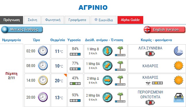 Ο καιρός στο Αγρίνιο σήμερα (Πέμπτη, 02/11)