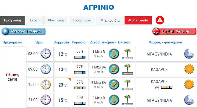 Ο καιρός στο Αγρίνιο σήμερα (Πέμπτη, 26/10)
