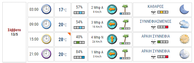 Το Σαββάτο 13 Μαΐου 2017 αναμένονται αραιές νεφώσεις που θα εναλλάσσονται με μεγάλα διαστήματα ηλιοφάνειας, ενώ τις θερμές ώρες της ημέρας υπάρχει πιθανότητα για ασθενείς σποραδικές βροχές μικρής διάρκειας στα ορεινά. Η συγκέντρωση Αφρικανικής σκόνης στην ατμόσφαιρα θα είναι αυξημένη. Η θερμοκρασία θα παρουσιάσει άνοδο της τάξης των 2 έως 5 βαθμών. Οι άνεμοι στα πελάγη θα φτάνουν τοπικά τα 7 μποφόρ.
