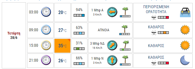 Την Τετάρτη, 28 Ιουνίου 2017 αναμένεται γενικά αίθριος καιρός, με τοπικές μόνο νεφώσεις στα ορεινά ηπειρωτικά της δυτικής και βόρειας χώρας, από το μεσημέρι κι έπειτα. Τοπικές βροχές αναμένονται τις ίδιες ώρες στα ορεινά της κεντρικής και ανατολικής Μακεδονίας και της Θράκης. Κατά τη διάρκεια της νύχτας η ορατότητα στα δυτικά και βόρεια θα είναι τοπικά περιορισμένη. Η θερμοκρασία θα παρουσιάσει μικρή άνοδο, φτάνοντας τοπικά τους 39 βαθμούς. Οι άνεμοι στο νότιο Αιγαίο θα φτάνουν τοπικά τα 6 μποφόρ.
