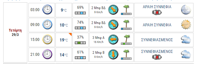 Την Τετάρτη, 29 Μαρτίου 2017 στην κεντρική και νότια ηπειρωτική χώρα, το νότιο Ιόνιο, και το κεντρικό και νότιο Αιγαίο αναμένονται νεφώσεις με τοπικές βροχές, που όμως θα εναλλάσσονται με διαστήματα ηλιοφάνειας. Το μεσημέρι και απόγευμα υπάρχει πιθανότητα για εκδήλωση σποραδικών όμβρων ή καταιγίδων στο νοτιοανατολικό Αιγαίο. Στην υπόλοιπη χώρα αναμένεται γενικά αίθριος καιρός, και μόνο το μεσημέρι και απόγευμα θα αναπτυχθούν τοπικές νεφώσεις. Η ορατότητα στα ηπειρωτικά κατά τη διάρκεια της νύχτας θα είναι τοπικά περιορισμένη. Η θερμοκρασία θα παρουσιάσει μικρή άνοδο στην κεντρική και βόρεια χώρα, και μικρή πτώση στην νότια. Οι άνεμοι στο Αιγαίο θα φτάνουν τοπικά τα 7 μποφόρ.