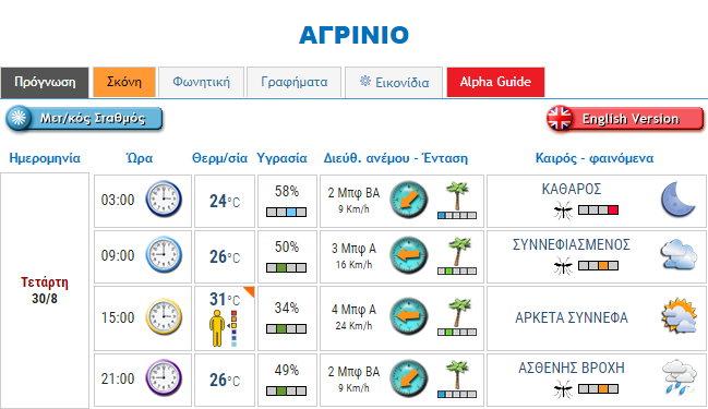 Ο καιρός στο Αγρίνιο σήμερα (Τετάρτη, 30/08)