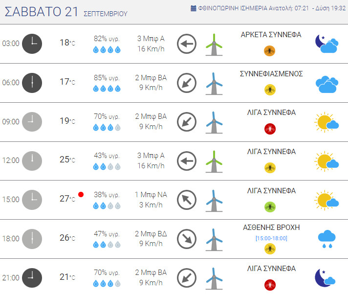 Για το Σάββατο, 21 Σεπτεμβρίου 2024 προβλέπονται λίγες νεφώσεις αυξημένες στα ανατολικά και στο Ιόνιο και βαθμιαία στα υπόλοιπα τμήματα, με βροχές και τοπικές καταιγίδες αρχικά σε Κεντρική και Δυτική Μακεδονία, Ανατολική Θεσσαλία, Σποράδες, Εύβοια και Ανατολική Στερεά και τις θερμές ώρες σε Ήπειρο, Δυτική Στερεά, Πελοπόννησο και στα υπόλοιπα κυρίως ορεινά ηπειρωτικά τμήματα.