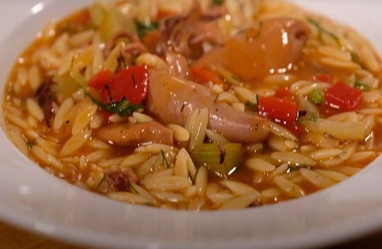 Προσθέτουμε τον υπόλοιπο ζωμό, τα καλαμαράκια με τη σάλτσα τους και συνεχίζουμε το μαγείρεμα μέχρι να χυλώσει το κριθαράκι.