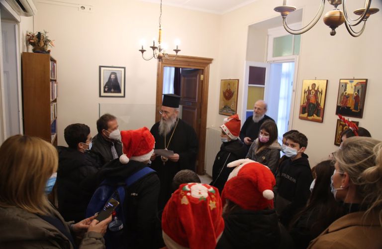 Ἐπίσης, ὁ Σεβ. Μητροπολίτης μας δέχθηκε στά Γραφεῖα τῆς Ἱερᾶς Μητροπόλεως τά παιδιά τῶν ἱερέων τῆς Μητροπόλεώς μας, πού εἶναι ἕως καί μαθητές τοῦ Λυκείου. Τά παιδιά τοῦ ἔψαλαν τά κάλαντα καί ὁ Σεβασμιώτατος τούς μίλησε κατάλληλα, κυρίως γιά τήν μεγάλη εὐλογία πού ἔχουν νά εἶναι παιδιά Ἱερέων καί προσέφερε στό καθένα ἀπό αὐτά εὐλογίες τά δῶρα γιά τά Χριστούγεννα καί τό νέο ἔτος».