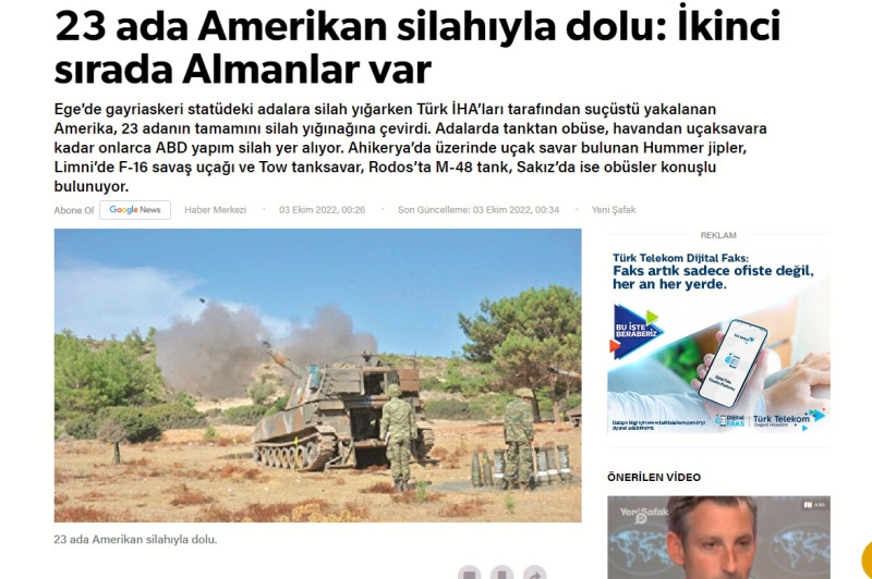 Χαρακτηριστικό είναι το δημοσίευμα της εφημερίδας Yeni Safak που αναφέρει «23 νησιά είναι γεμάτα με αμερικανικά όπλα».