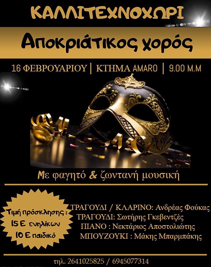 Το Καλλιτεχνοχώρι διοργανώνει και σας προσκαλεί στον πρώτο του Αποκριάτικο χορό που θα πραγματοποιηθεί στις 16 Φεβρουαρίου 2020 και ώρα 9 μ. μ. στο κέντρο ΑΜΑΡΟ (Άγιος Ιωάννης Ρηγανάς)