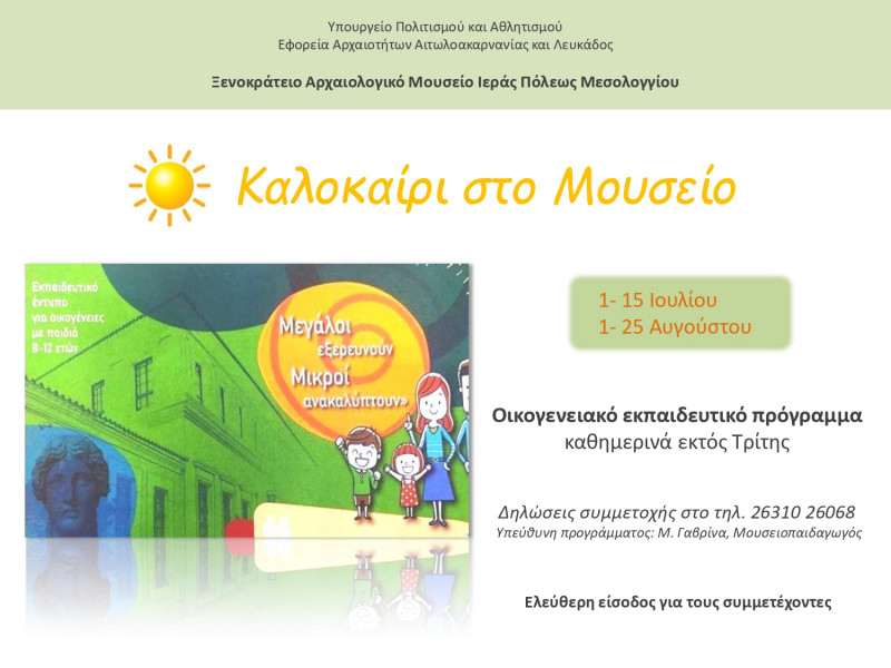 H Εφορεία Αρχαιοτήτων Αιτωλοακαρνανίας και Λευκάδας θα υλοποιήσει τη δράση «Καλοκαίρι στο Μουσείο», μέσω του εκπαιδευτικού προγράμματος για οικογένειες με παιδιά, ηλικίας από 8 έως 12 ετών,