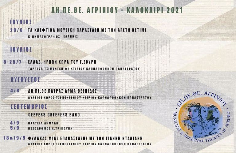 Το Δη.Πε.θε. ΑΓΡΙΝΙΟΥ χαιρετίζει το άνοιγμα των δραστηριοτήτων στο χώρο του πολιτισμού μετά τις πρωτόγνωρες συνθήκες λόγω της πανδημίας με παραστάσεις που παρουσιάζονται σε ανοιχτούς χώρους και αφορούν μόνο καθήμενους και όχι όρθιους θεατές, με σταθερό ποσοστό πληρότητας 50% και συγκεκριμένη ταξιθεσία.