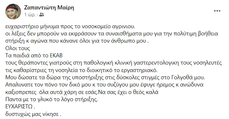 Η ίδια η σύζυγός του με ένα συγκινητικό μήνυμα μέσω των social media στο Facebook θέλησε να ευχαριστήσει τόσο το προσωπικό του Γ.Ν. Αιτωλοακαρνανίας, όσο και τους εργαζόμενους του Ε.Κ.Α.Β. για τη συμπεριφορά τους καθ’ όλη τη διάρκεια της νοσηλείας του.
