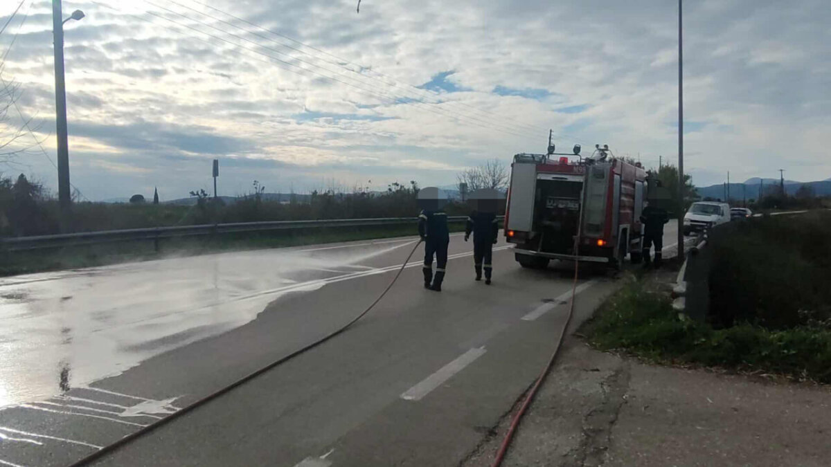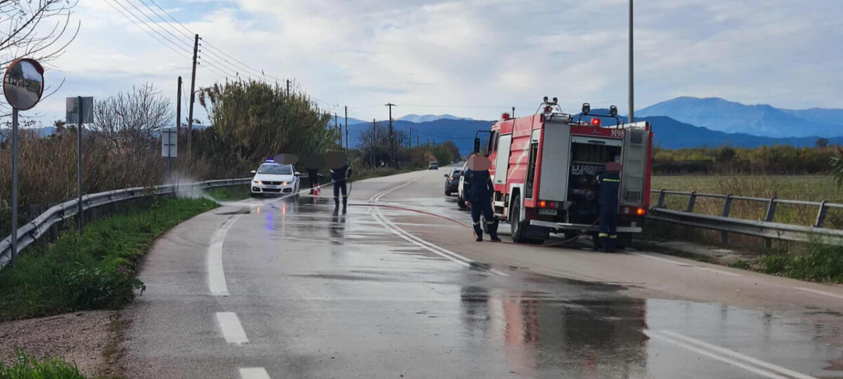 Επιτόπου έφτασαν δυνάμεις της πυροσβεστικής προκειμένου να καθαρίσουν το οδόστρωμα.