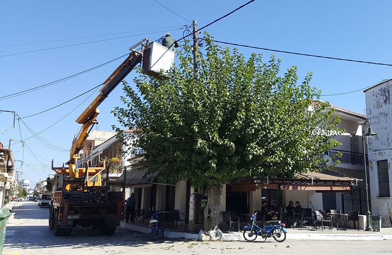 Πολυμελές τεχνικό συνεργείο, με εναερίτες και ειδικό γερανοφόρο όχημα που έχει εγκαταστήσει ο ιδιώτης εργολάβος ο οποίος έχει υπογράψει σύμβαση με τον ΔΕΔΔΗΕ, πραγματοποίησε τις εργασίες αλλαγής των παλιών καλωδίων (γυμνών αγωγών) με τη χρήση υλικών νεώτερης τεχνολογίας.
