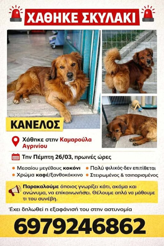 Ανάστατοι άπαντες στην Καμαρούλα Αγρινίου με αφορμή την εξαφάνιση ενός σκύλου που ακούει στο όνομα «Κανέλος» – Δηλώθηκε στην Αστυνομία η εξαφάνιση του τετράποδου.