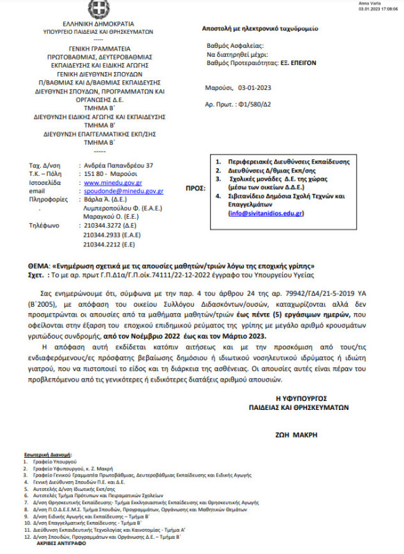 Να καταχωρίζονται, χωρίς να προσμετρώνται, οι απουσίες έως πέντε εργάσιμων ημερών που οφείλονται σε εποχικό επιδημικό ρεύμα της γρίπης από τον Νοέμβριο 2022 έως και τον Μάρτιο 2023 προβλέπει εγκύκλιος της Υφυπουργού Παιδείας και Θρησκευμάτων κ. Ζέττας Μακρή και εστάλη στις Σχολικές Μονάδες Πρωτοβάθμιας και Δευτεροβάθμιας Εκπαίδευσης όλης της Χώρας.