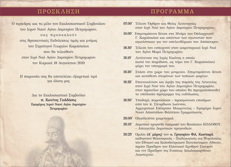 Τα «Καραϊσκάκεια 2019» θα πραγματοποιηθούν την Κυριακή 18 Αυγούστου και περιλαμβάνουν απαγγελίες ποιημάτων και δημοτικών τραγουδιών, ομιλίες καθώς και ευχαριστίες του αιδεσιμώτατου πατρός Κων/νου Γιολδάση, Εφημερίου Ιερού ναού Αγίου Δημητρίου Πετροχωρίου.