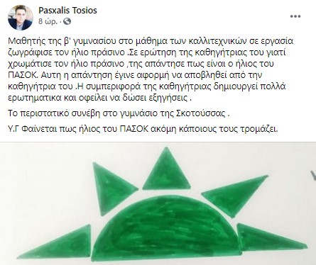 Συγκεκριμένα, σύμφωνα με όσα αναφέρει, ένας μαθητής που φοιτά στο γυμνάσιο της Σκοτούσσας αποβλήθηκε επειδή ζωγράφισε στο μάθημα των καλλιτεχνικών τον ήλιο του ΠΑ.ΣΟ.Κ.