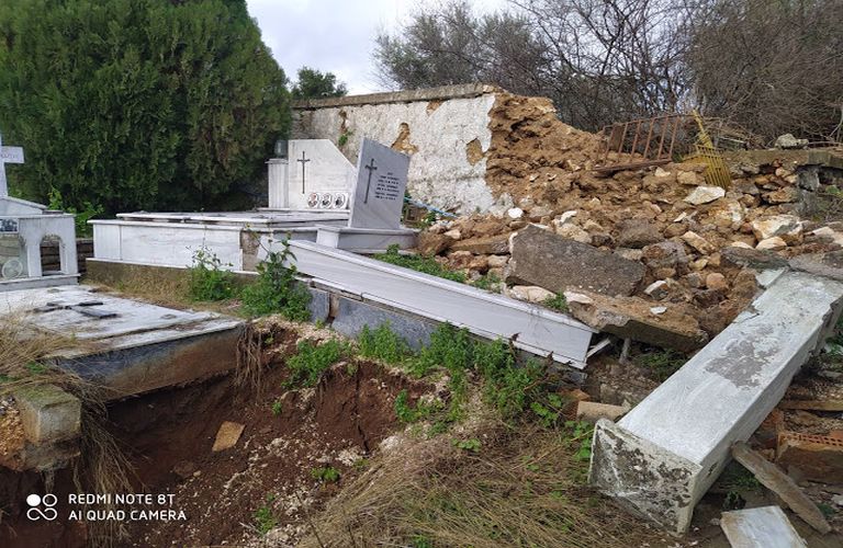 - Ο μαντρότοιχος έχει καταρρεύσει με τα κάγκελα να έχουν καταστραφεί ολοκληρωτικά με αποτέλεσμα να καταπλακωθούν πολλά μνήματα και το κοιμητήριο να παραμένει ανοιχτό, ενώ η εξωτερική πόρτα δεν κλείνει.
