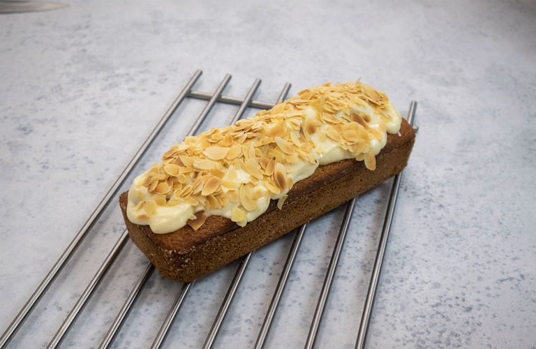 Για την κρέμα: Σε ένα μπολ ανακατεύουμε καλά το βούτυρο, το τυρί κρέμα, τη ζάχαρη άχνη και την εσάνς βανίλιας. Απλώνουμε ομοιόμορφα πάνω από το κέικ και πασπαλίζουμε με καβουρδισμένο αμύγδαλο.