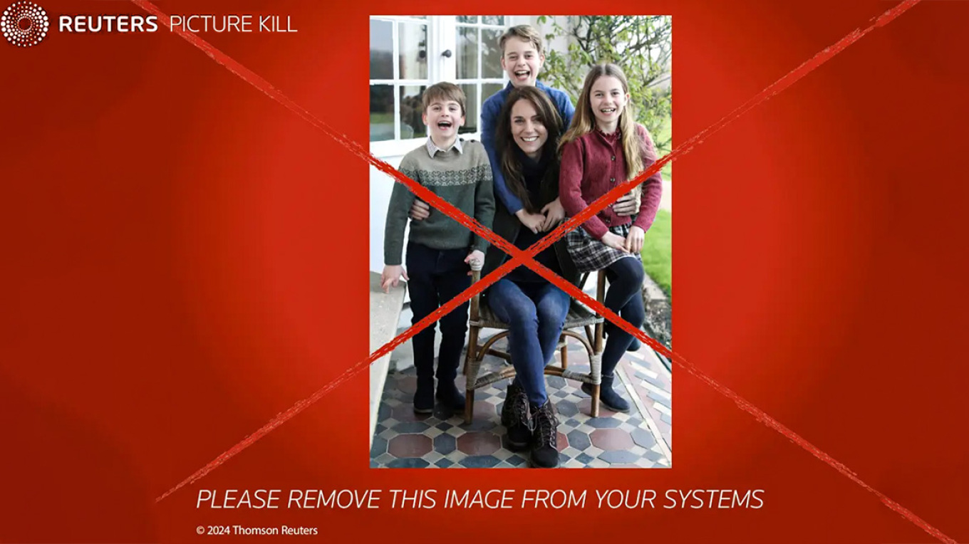 Νέες διαστάσεις στο θρίλερ σχετικά με το τι πραγματικά συμβαίνει με την υγεία της Κέιτ Μίντλετον προκαλεί η απόφαση μεγάλων φωτοειδησεογραφικών πρακτορείων να αποσύρουν την πρώτη επίσημη φωτογραφία της μελλοντικής βασίλισσας της Αγγλίας μετά το χειρουργείο στο οποίο υποβλήθηκε, υποστηρίζοντας ότι η εικόνα της συζύγου του πρίγκιπα Ουίλιαμ με τα τρία παιδιά τους είναι «πειραγμένη».