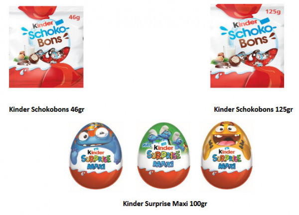 Όπως ανακοινώθηκε, ο ΕΦΕΤ στο πλαίσιο της συνεργασίας του με την Ευρωπαϊκή Επιτροπή και όσον αφορά στην προληπτική ανάκληση προϊόντων Kinder λόγω πιθανής παρουσίας σαλμονέλας, ενημερώνει ότι η εν λόγω ανάκληση επεκτείνεται πλέον στο σύνολο των προϊόντων «Kinder Schokobons» και «Kinder Surprise Maxi» των 100gr, ανεξαρτήτου παρτίδας.