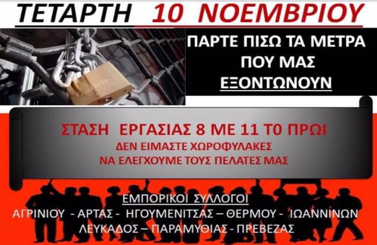 Καλούμε τις Περιφέρειες Ηπείρου, Ιονίων Νήσων και Δυτικής Ελλάδας, τους Βουλευτές των Νομών και τους Δημάρχους των πόλεων να πιέσουν την Κυβέρνηση να πάρει πίσω τα μέτρα που πριν λίγες ημέρες αποφάσισε τα οποία πλήττουν για ακόμη μια φορά τις μικρές επιχειρήσεις της αγοράς.