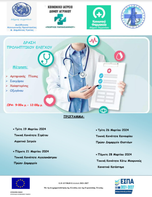 Το Κοινωνικό Ιατρείο και Κοινωνικό Φαρμακείο της Διεύθυνσης Κοινωνικής Προστασίας και Δημόσιας Υγείας του Δήμου Αγρινίου στα πλαίσια υλοποίησης δράσεων προληπτικού ελέγχου με σκοπό την προστασία και προαγωγή της δημόσιας υγείας θα πραγματοποιήσει δωρεάν μέτρηση σακχάρου, χοληστερίνης, αρτηριακής πίεσης και οξυγόνου (κορεσμού) σε τοπικές κοινότητες του Δήμου Αγρινίου.