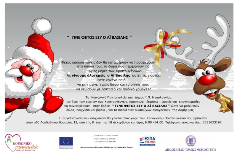 Το Κοινωνικό Παντοπωλείο του Δήμου Ι.Π. Μεσολογγίου, ενόψει των εορτών των Χριστουγέννων, προσκαλεί δημότες, φορείς και επαγγελματίες να συνεισφέρουν στην εκστρατεία «Γίνε εσύ φέτος ο Αϊ Βασίλης» ώστε να μαζευτούν δώρα, παιχνίδια και βιβλία, τα οποία θα διατεθούν στα παιδιά των δικαιούχων οικογενειών της Δομής μας.