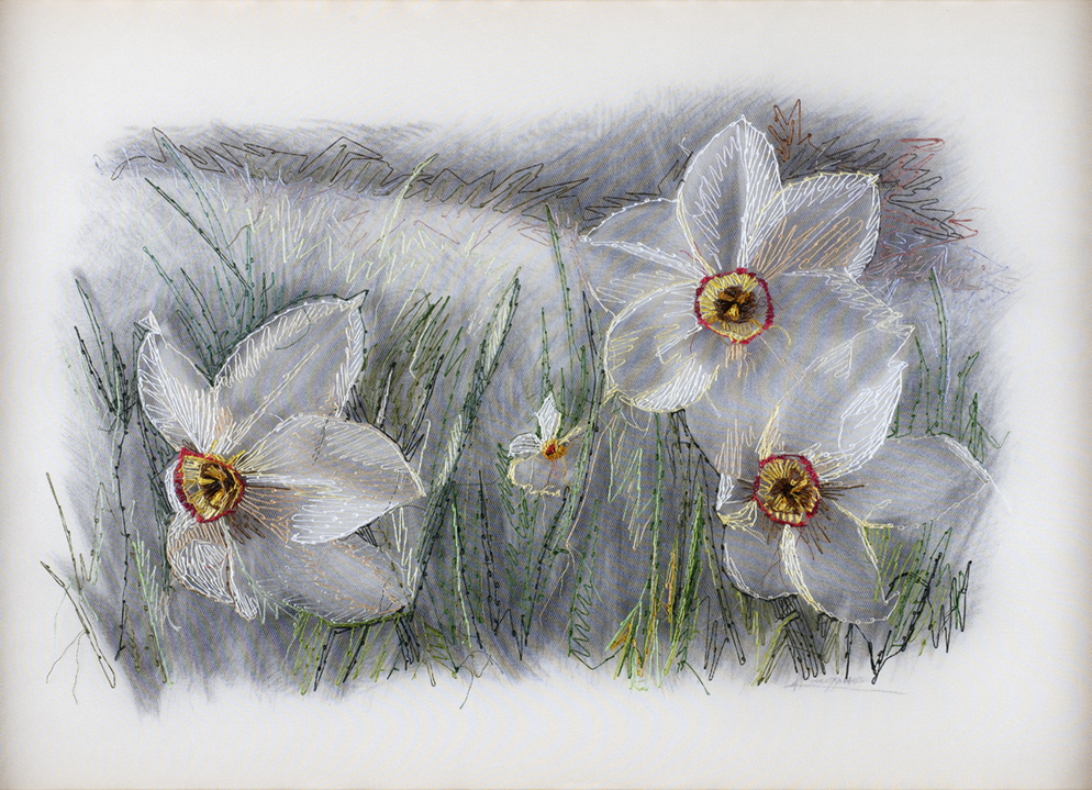 Στη νέα αυτή ενότητα της δουλειάς της, η Κωνσταντίνα Συλίκου δημιουργεί συνθέσεις σε καμβά, όπου το σχέδιο από κάρβουνο διακρίνεται μέσα από λεπτά υφάσματα και συνδιαλέγεται με τη γραφή της βελονιάς, ενώ η τελική εικόνα σχηματίζεται μόνο όταν η πλαισίωση επιβάλλει την απόσταση ανάμεσα στις αλλεπάλληλες στρώσεις του έργου.