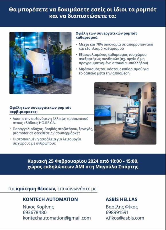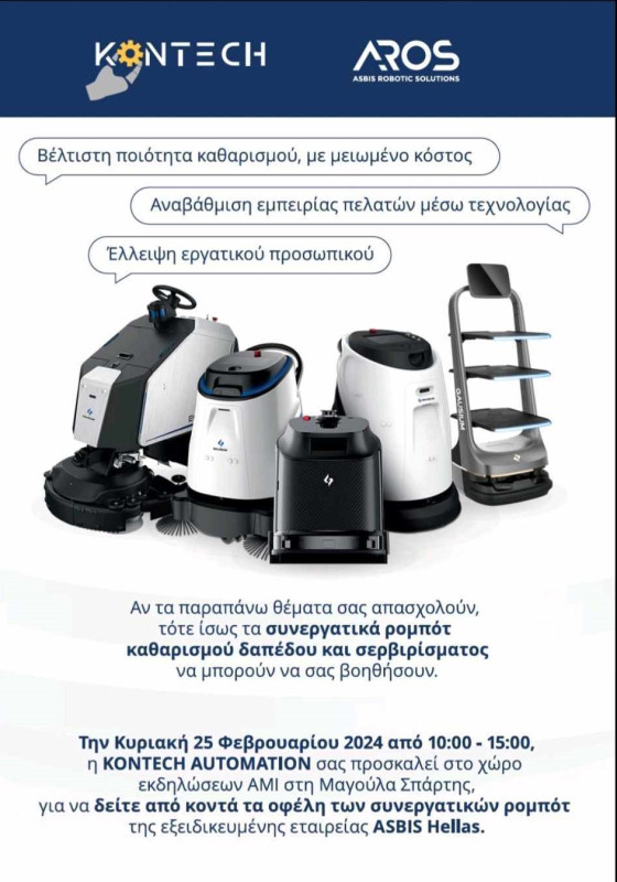 Την Κυριακή, 25 Φεβρουαρίου 2024 η KONTECH AUTOMATION θα πραγματοποιήσει εκδήλωση με σκοπό να παρουσιάσει τα οφέλη των συνεργατικών ρομπότ της εξειδικευμένης εταιρείας ASBIS Hellas! Η εκδήλωση θα πραγματοποιηθεί στο χώρο εκδηλώσεων AMI στη Μαγούλα Σπάρτης.