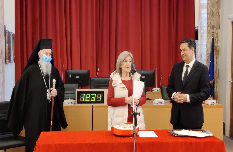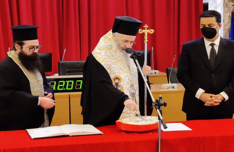 Την πίτα του Δήμου Αγρινίου ευλόγησε ο Σεβασμιότατος Μητροπολίτης Ναυπάκτου και Αγίου Βλασίου Ιερόθεος – Τοποτηρητής της Ιεράς Μητροπόλεως Αιτωλίας και Ακαρνανίας ο οποίος ευχήθηκε καλή χρονιά σε εργαζόμενους και την Δημοτική Αρχή.