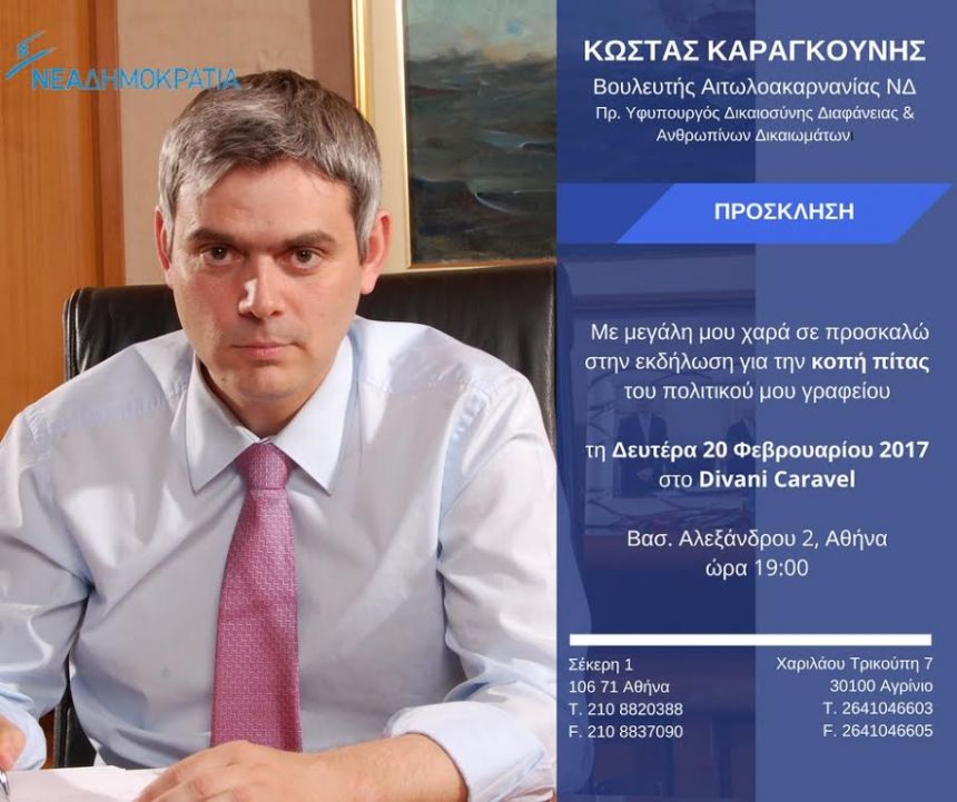 Ο βουλευτής της ΝΔ Κώστας Καραγκούνης διοργανώνει στην Αθήνα εκδήλωση για την κοπή της πρωτοχρονιάτικης πίτας του πολιτικού του γραφείου. Η εκδήλωση θα πραγματοποιηθεί τη Δευτέρα 20 Φεβρουαρίου 2017 και ώρα 19:00 στο Ξενοδοχείο Divani Caravel (Βασιλ. Αλεξάνδρου 2). Εκεί θα έχουν τη δυνατότητα οι ετεροδημότες αλλά και όποιος άλλος επιθυμεί να τον συναντήσουν και να συζητήσουν για τις πολιτικές εξελίξεις γενικώς αλλά και για τα θέματα τα νομού ειδικότερα.