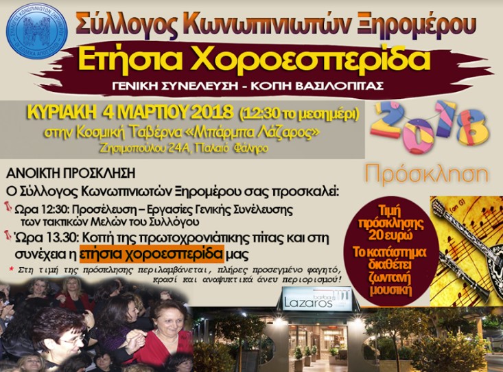 Ο Σύλλογος Κωνωπινιωτών Ξηρομέρου προσκαλεί, όλα τα Μέλη και τους Φίλους του, να παρευρεθούν στις 4 Μαρτίου 2018, ημέρα Κυριακή και ώρα 12.30, στη Κοσμική Ταβέρνα « Μπάρμπα Λάζαρος » Ζησιμοπούλου 24Α, Παλαιό Φάληρο, όπου θα πραγματοποιηθούν: