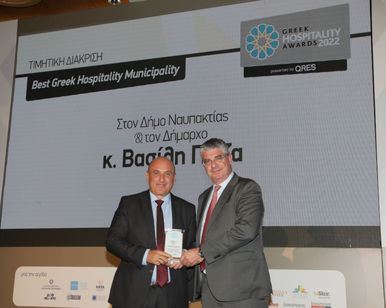 Με το κορυφαίο βραβείο «Best Greek Hospitality Municipality» τιμήθηκε ο Δήμος Ναυπακτίας για το έτος 2022, στο πλαίσιο του καταξιωμένου θεσμού «Greek Hospitality Awards» που πραγματοποιήθηκε υπό την Αιγίδα του Υπουργείου Τουρισμού και του Ε.Ο.Τ. Το τιμητικό βραβείο παρέλαβε ο Δήμαρχος Ναυπακτίας κ. Βασίλης Γκίζας συνοδευόμενος από τον αρμόδιο Αντιδήμαρχο Τουρισμού κ. Ντίνο Τσουκαλά. Στόχος του θεσμού είναι η επιβράβευση των κορυφαίων ξενοδοχειακών και τουριστικών επιχειρήσεων της χώρας με κριτήριο την ποιότητα και το υψηλό επίπεδο των προσφερόμενων υπηρεσιών τους.