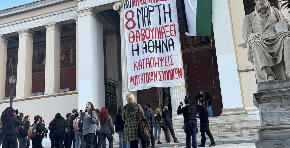Συμβολική κατάληψη πραγματοποιούν αυτή την ώρα φοιτητές στην πρυτανεία του ΕΚΠΑ. Φοιτητές του Πανεπιστημίου, εργαζόμενοι και φορείς του ιδρύματος, όπως και φοιτητές από φοιτητικούς συλλόγους της Αθήνας, ενώνουν τις φωνές τους. Παράλληλα, έχουν κρεμάσει και μια σημαία της Παλαιστίνης και φωνάζουν συνθήματα κατά του πολέμου.