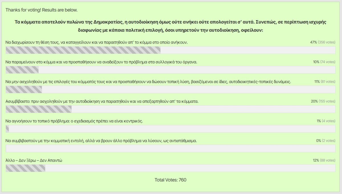 Σχεδόν οι μισοί (ποσοστό 47% -356 ψήφοι) επέλεξαν την προτεινόμενη απάντηση «να διαχωρίσουν τη θέση τους, να καταγγείλουν και να παραιτηθούν απ’ το Κόμμα στο οποίο ανήκουν».