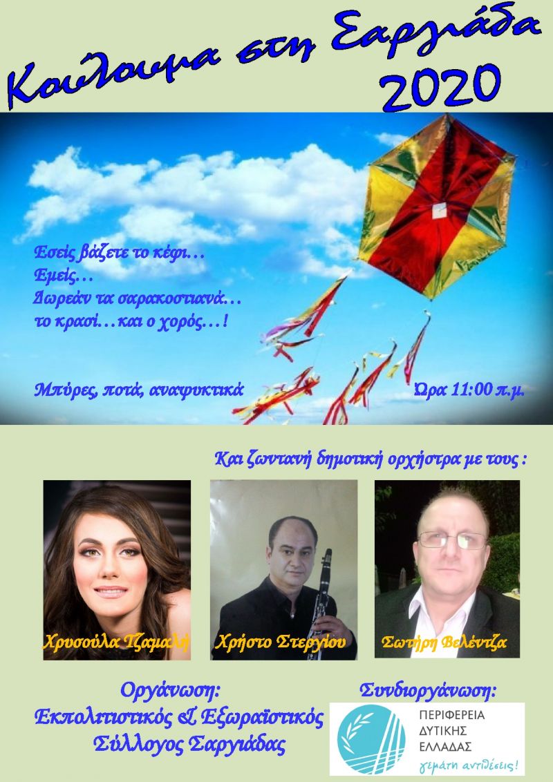 Ο Πρόεδρος και τα μέλη του Διοικητικού Συμβουλίου του Εκπολιτιστικού και Εξωραϊστικού Συλλόγου Σαργιάδας σας προσκαλούν στα Κούλουμα 2020, που συνδιοργανώνουν με την Περιφέρεια Δυτικής Ελλάδας, την καθαρά Δευτέρα 2 Μαρτίου στη Σαργιάδα Αγρινίου και ώρα 11:00 π.μ.