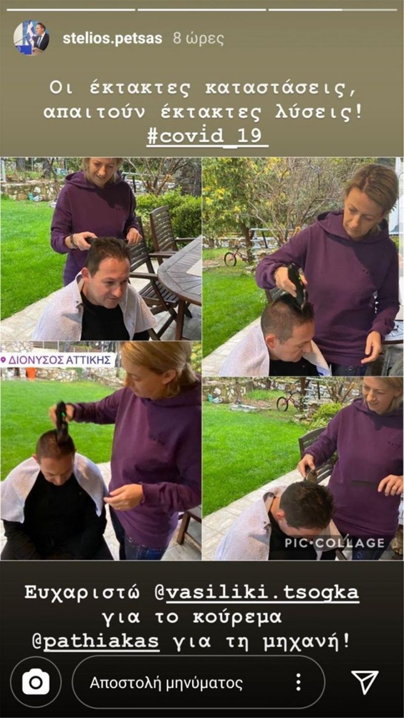 Έτσι, ο Στέλιος Πέτσας εμπιστεύτηκε τα χέρια της συζύγου του, η οποία τον κούρεψε στην αυλή του σπιτιού τους. Με την ανάρτησή του ευχαρίστησε την σύζυγό του Βασιλική Τσόγκα για το κούρεμα.