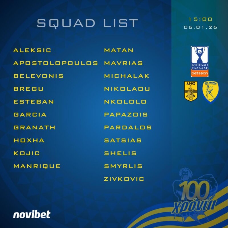 Στην αποστολή του αυριανού (06/01, 15:00) εκτός έδρας αγώνα Κυπέλλου Ελλάδας Betsson με τον Άρη, συμμετέχουν οι Ποδοσφαιριστές: