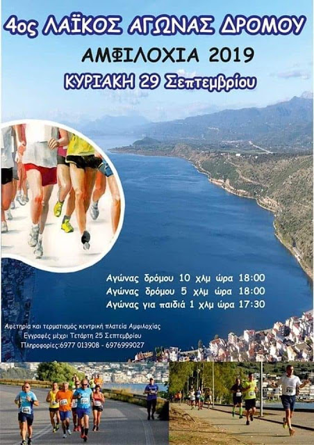 Την Κυριακή, 29 Σεπτεμβρίου θα πραγματοποιηθεί ο 4ος Λαϊκός αγώνας δρόμου Αμφιλοχίας που συμπεριλαμβάνει τρεις αγώνες. Αγώνας δρόμου 10 χλμ ώρα στις 18:00, Αγώνας δρόμου 5 χλμ ώρα στις 18:00 και Αγώνας για παιδιά 1 χλμ ώρα στις 17:30.